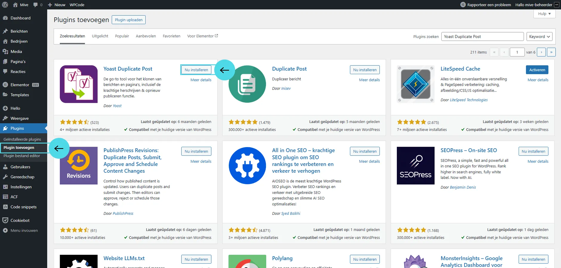 1. Ga naar Plugins → Nieuwe plugin → Zoek op “Yoast Duplicate Post” en klik op Nu installeren en daarna Activeren.